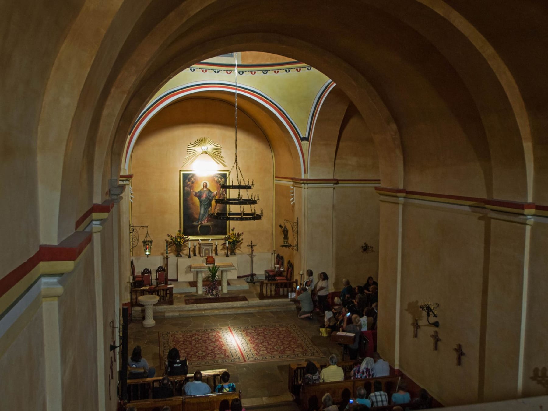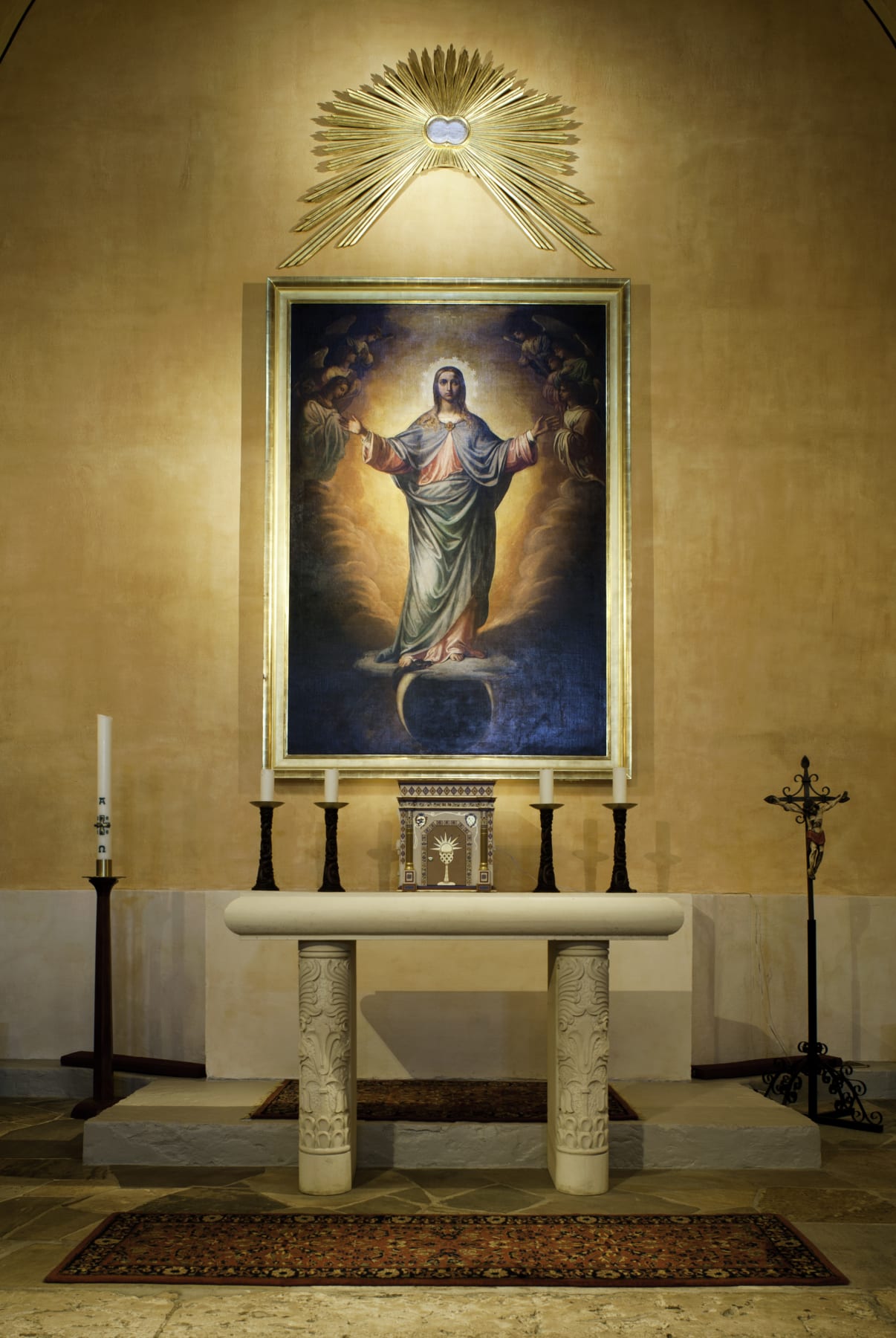 Each August 15th, on the feast of the Assumption of Mary, the setting sun shines through the round ocular window above the front door to Mission Concepción, casting a beam of light which travels across the wooden pews and passes directly under the center of the dome at 6:30 pm. Meanwhile, a second beam of light passes through the west window in the raised drum on which the dome rests, casting a beam of light directly above the portrait of the Assumption of Mary hung on the wall behind the altar.