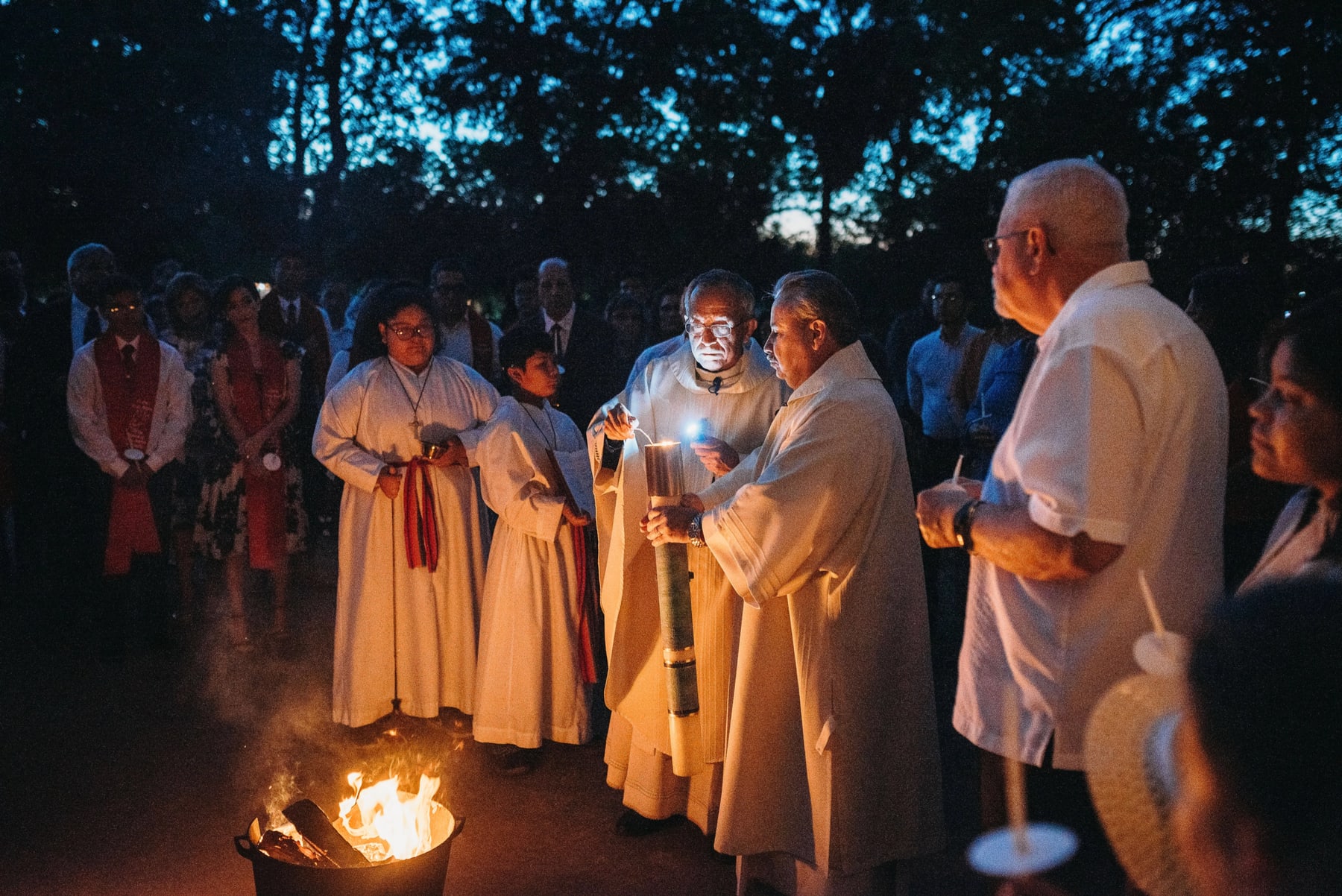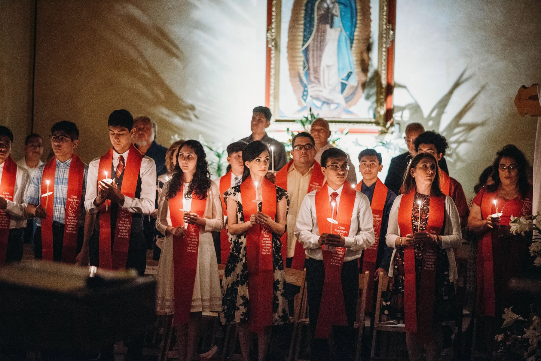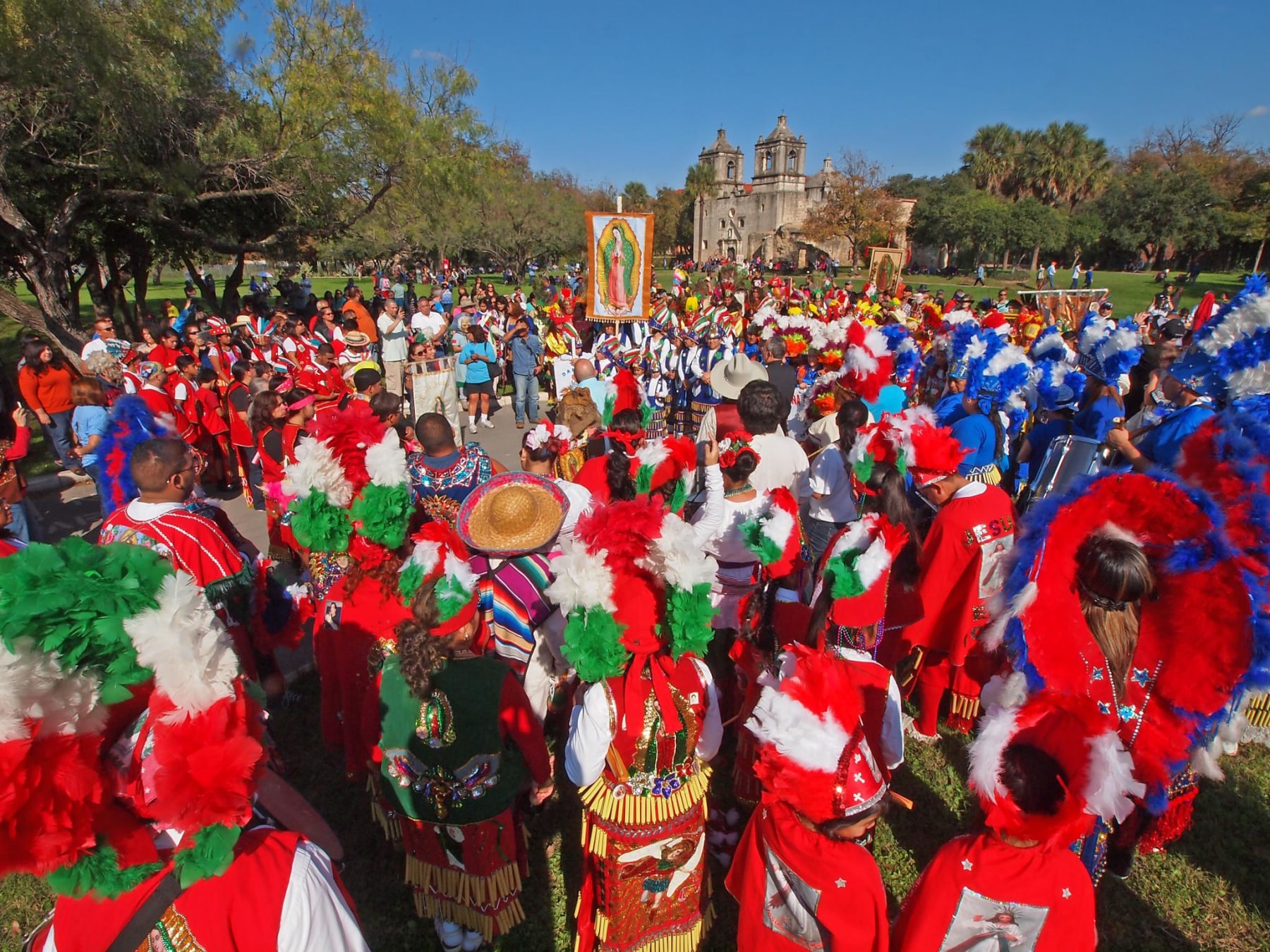 Matachines gather for a blessing from Father David Garcia. Matachines gather each December at Mission Concepción in honor of two important dates in the Catholic Calendar that honor Mary, to whom the Mission is dedicated: the Feast of the Annunciation and the Feast of the Virgin of Guadalupe. Each group of Matachines represents a parish from the Archdiocese of San Antonio and each group creates their own costumes and special dance to honor Mary. They begin with a blessing, then after a procession to the river, they return to the Mission to enter the church one group at a time to perform their dance of homage.