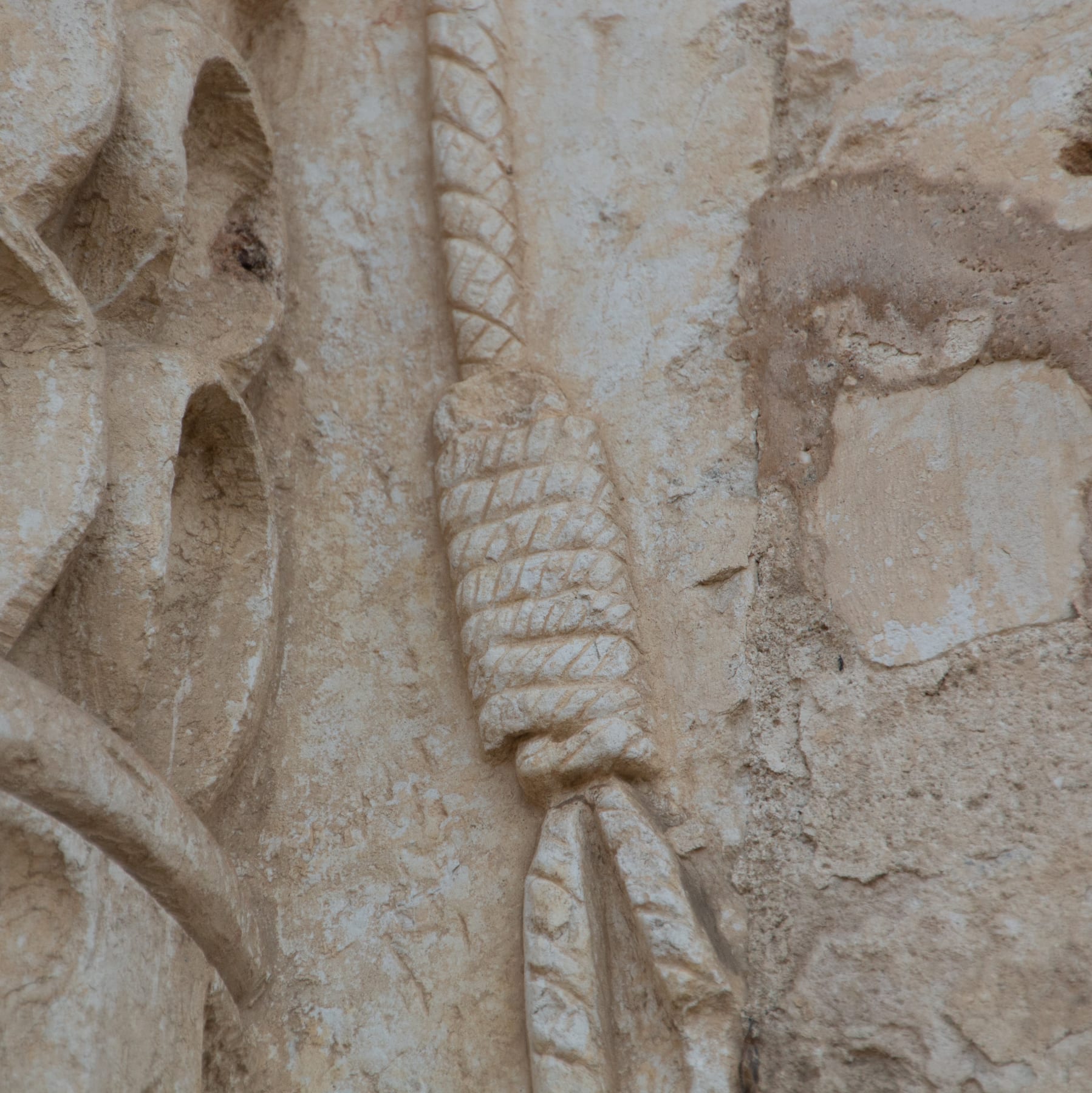 The San Antonio Missions were founded by members of the Franciscan Order, and you can find many Franciscan symbols along El Camino. This knotted rope, found at the front entrance of Mission Concepción represents the corded rope belts worn by Franciscan priests. These belts, called cinctures, have three knots, symbolizing the three cornerstones of the Franciscan Order: poverty, chastity, and obedience.